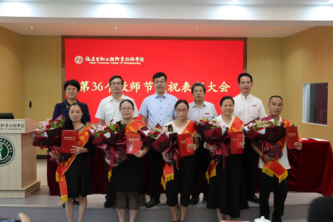 会议在雄壮庄严的奏唱国歌声中拉开序幕。龙院长首先代表学校向默默耕耘在教育战线、为学校事业发展做出积极贡献的广大教职工和离退休老同志致以节日的亲切问候和良好祝愿。会议表彰了2020年福建省优秀教师、2020年学校教书育人楷模、最美辅导员、优秀班主任以及2019-2020学年度优秀实习带教教师;向从教满三十周年的男教师、从教满二十五周年的女教师颁发荣誉证书并献花;通报了2019—2020学年获得校级以上荣誉的单位和个人;举行了新入职教师宣誓和签署师德师风承诺书仪式;安排了学校2020年教书育人楷模童文琴老师作为教师代表发言。