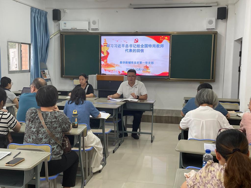 教学教辅党总支第一党支部书记刘文君传达学习了习近平总书记给全国特岗教师代表的重要回信精神,阐述了特岗教师在教育事业中的奉献精神与重要作用,以及习近平总书记对该群体的关心鼓励,激励在场党员始终坚守教育初心、牢记育人使命。
