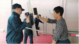 校园巡逻队快速赶到,和我校门卫安保人员用钢叉和盾牌等器具进行防卫,全力制止“歹徒”进入教学楼内。