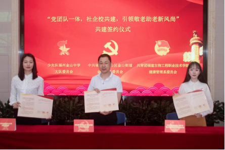 5月29日,我校联合金洲社区党委和金山中学大队委,开展“党团队一体,社企校共建,引领敬老助老新风尚”共建签约仪式。仪式上,金洲社区党委书记刘学峰、我校健康管理系分团委书记陈静思、福州金山中学少先队总辅导员宁丽萍一同签署下共建协议。