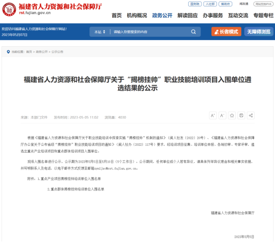 5月5日,福建省人力资源和社会保障厅公示了“揭榜挂帅”职业技能培训项目入围单位遴选结果,我校养老护理员与健康管理师工种成功入围康养人才培训项目名单。
