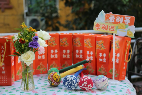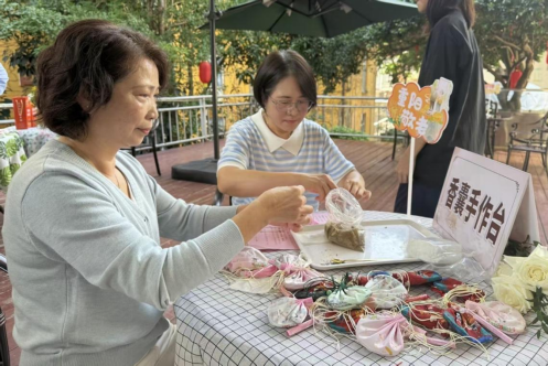 “杏林书厢”旁的榕树下,老同志们两两搭档,亲手体验创意插花。在花艺师的悉心指点下,大家巧手翻飞,将秋日的绚美定格于花篮之中,以花传情,共赏重阳雅趣。