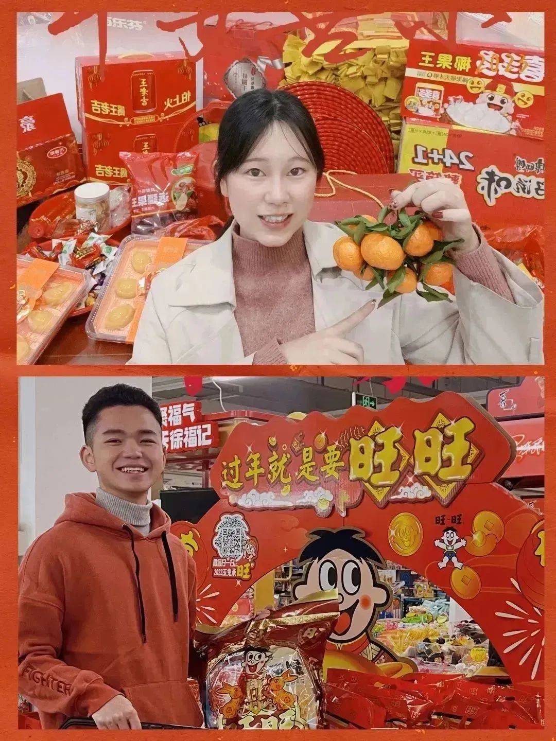 颜值担当卢淑惠学姐和周群明学弟精心挑选自己喜欢的年货,送上灿烂的笑脸,祝愿大家新年吉祥如意、有盼有趣!