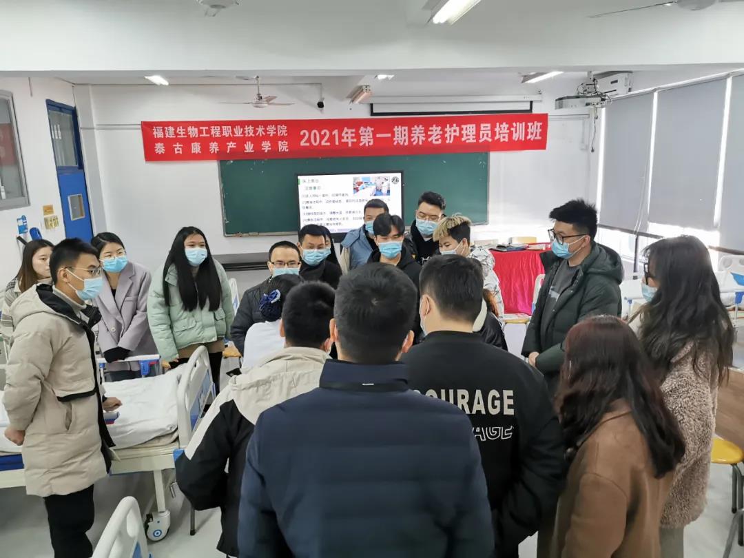 为贯彻落实国务院《关于推进养老服务发展的意见》,建立完善养老护理员职业技能等级认定和教育培训制度工作,提升养老护理员专业化、职业化、规范化水平,2021年1月13日,福建省首批“养老护理员”职业技能认定单位——福建生物工程职业技术学院开办了第一期养老护理员培训班,来自福建省泰古健康产业有限公司的员工成为首批受训学员。