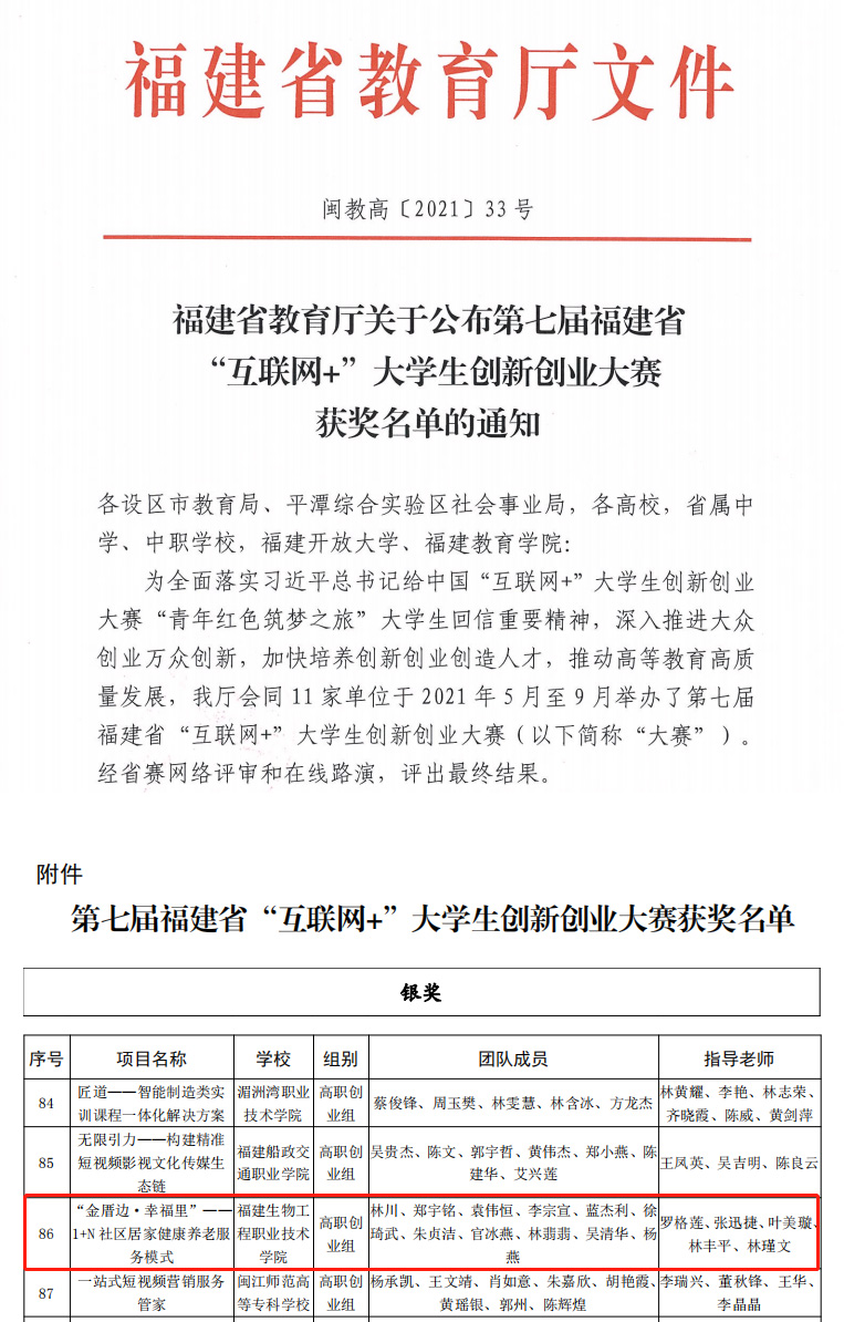 近日,福建省教育厅公布第七届福建省“互联网+”大学生创新创业大赛获奖名单,福建生物工程职业技术学院泰古康养产业学院大学生创业项目“金厝边 · 幸福里”——1+N社区居家健康养老服务模式获得职教赛道银奖。