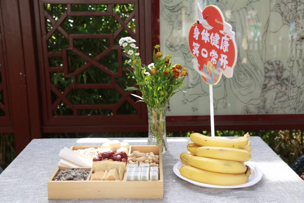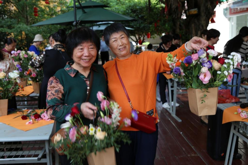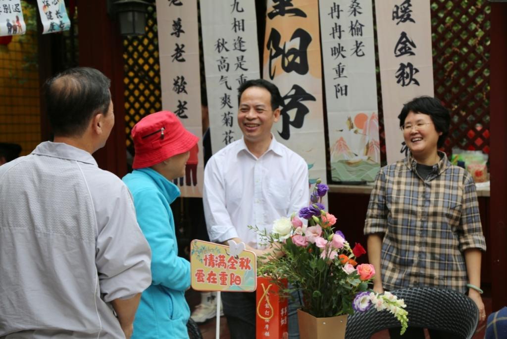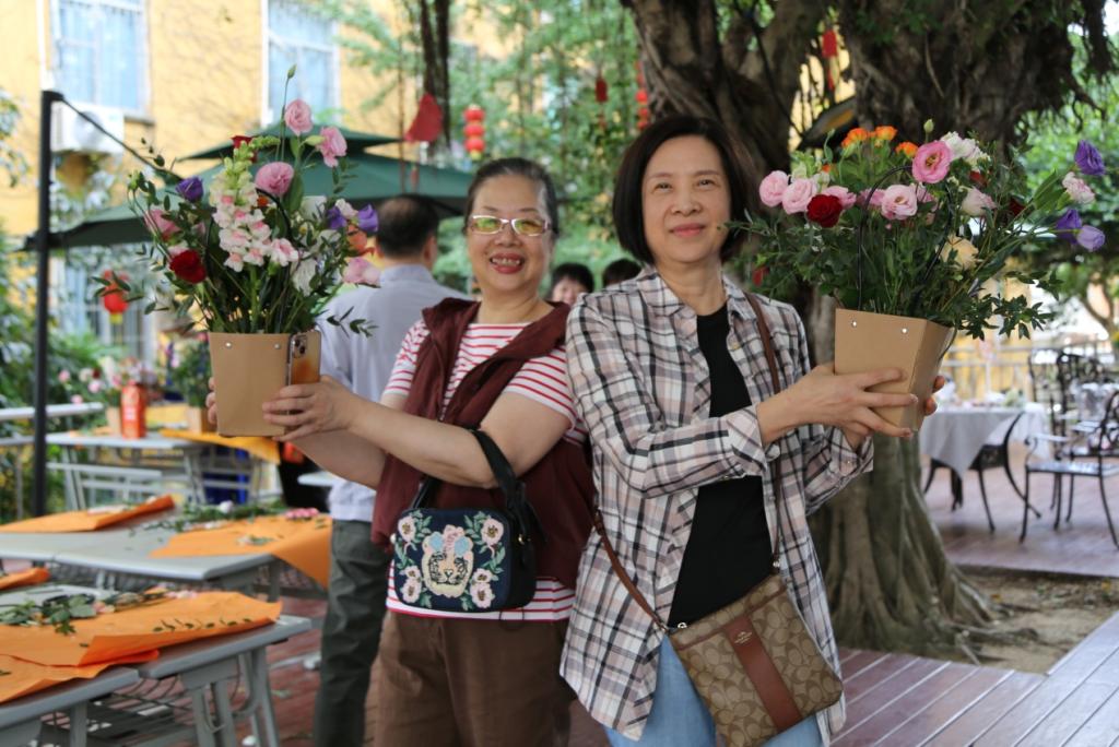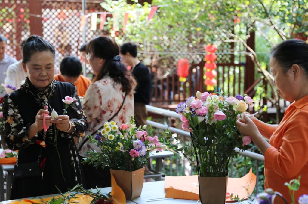 “杏林书厢”旁的榕树下,老同志们两两搭档,亲手体验创意插花。在花艺师的悉心指点下,大家巧手翻飞,将秋日的绚美定格于花篮之中,以花传情,共赏重阳雅趣。