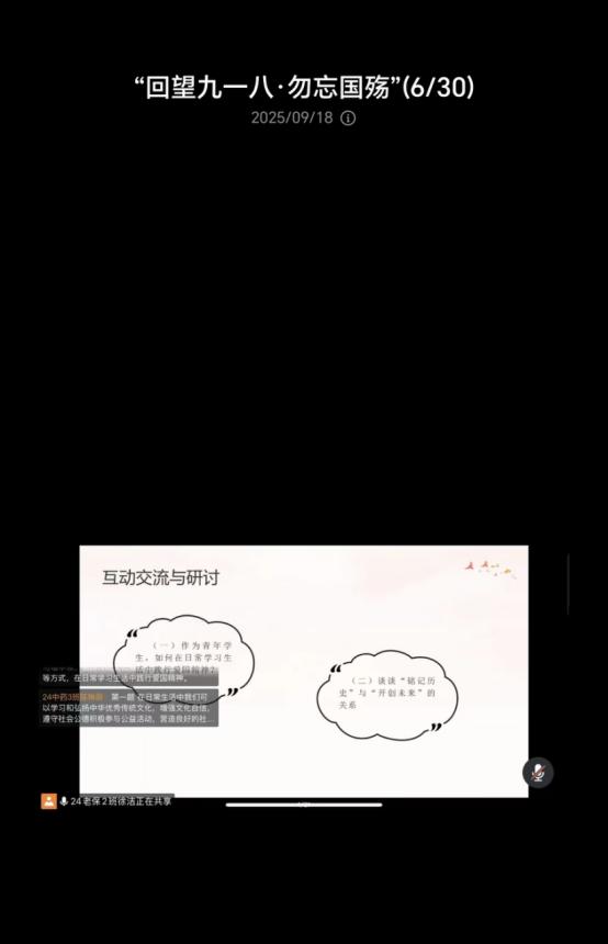 接着,大家一起云上观看了九一八事变历史纪录片,镜头中,柳条湖事件的阴谋策划、东北军北大营的骤然炮火、沦陷区同胞的血泪苦难,以及抗日义勇军挺身而出的抗争画面,将大家带回那段山河破碎、烽火连天的岁月。黑白影像里的历史碎片,与讲解员对事变背景、发展脉络及历史影响的细致解读相互呼应,让社团成员深刻认识到九一八事变是日本帝国主义侵华的开端,更体会到中华民族在危难之际不屈不挠的抗争精神。