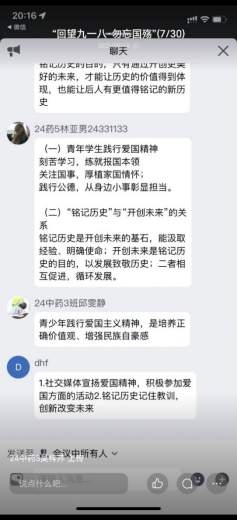 活动尾声,大家在云端开展主题鲜明的线上交流与研讨:作为青年学生如何在日常学习生活中践行爱国精神?谈谈铭记历史与开创未来的关系?大家各抒己见,有的同学剖析了九一八事变背后的历史必然与现实警示;有的同学分享了走访抗战老兵的感悟,提出“铭记不是为了延续仇恨,而是为了守护和平”的观点;青年学子纷纷表示,作为新时代青年,要将历史的教训转化为奋进的动力,把个人理想融入国家发展大局,用实际行动践行强国有我的誓言。