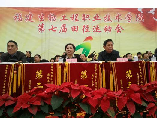 本台报道 为树立我院全体师生“全民健身”观念,增强同学们的竞争意识和凝聚力,提高同学们的身心素质,12月13日,福建生物工程职业技术学院2012年第七届田径运动会于我院齐安校区操场隆重举行。省食品药品监督局局长李德仁、纪检组长俞开海、省局人事处处长沈再生、院党委书记林碧芳、院长黄庶亮、纪检书记吴月树、副院长黄典焕、办公室主任丰理文、院团委书记董惠文、组织人事处处长张福辉、教务处处长廖存信以及各系领导嘉宾出席本次校运会的开幕式。