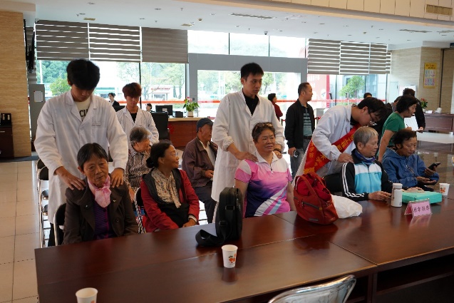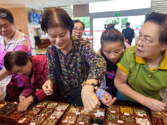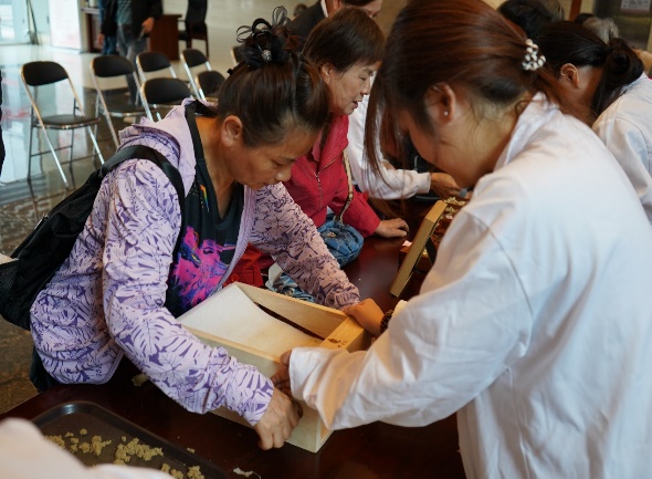沉浸式体验区成为全场焦点,三大特色区域各展风采。在中医药文创区,教师与志愿者细致讲解了甘草、黄芪等常用药材的鉴别要点与保健功效,并指导老党员们亲手制作中药文创手链。大家精心挑选心仪药材,在协助下完成专属作品,切身感受中医药的创意魅力。艾柱制作区前,教师现场示范艾绒挑选与卷制技巧,老党员们认真实操,成功卷制出紧实的艾柱,脸上洋溢着成就感。教师们还同步讲解了居家艾灸的规范操作与注意事项。推拿按摩区更显温情,学生志愿者运用专业手法为老党员舒缓颈肩腰腿不适,并耐心传授日常保健小窍门,贴心解答养生疑问,其专业细致的服务赢得了老同志们“手法专业又耐心,按完浑身都轻松!”的由衷称赞。