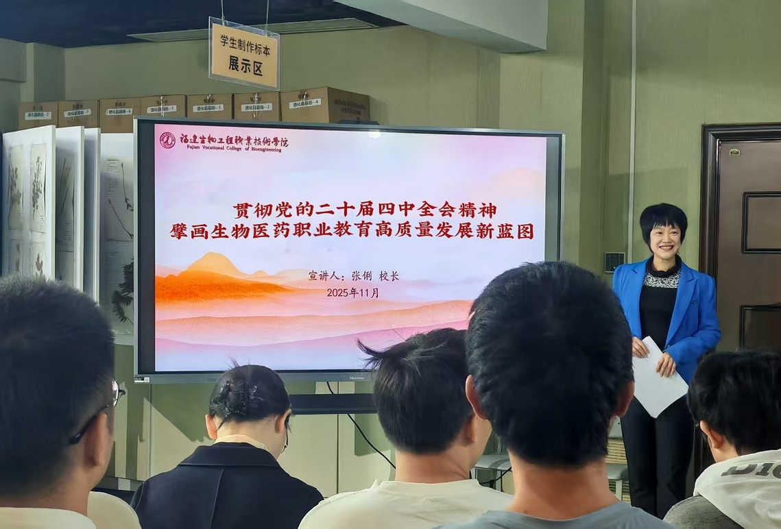 张俐校长紧紧围绕党的二十届四中全会精神的核心要义,结合生物医药产业发展趋势与我校办学实际,从深刻把握全会重大意义、精准对接“十五五”规划蓝图、全面落实教育领域新部署新要求等方面进行了系统阐述和深入解读。她指出,全会精神为新时代职业教育,特别是生物医药领域高质量发展指明了前进方向、提供了根本遵循。